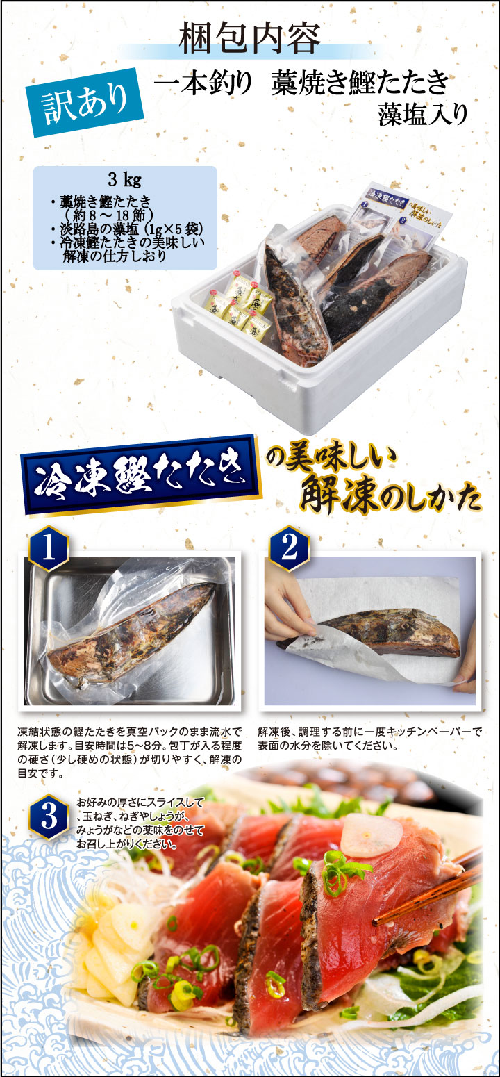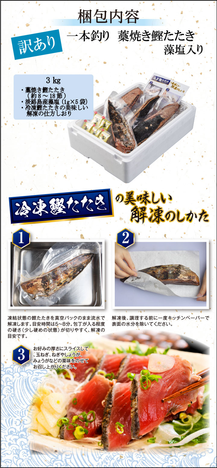 一本釣り藁焼きかつおたたき3kg(藻塩入り)【訳あり】